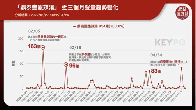 另外从《KEYPO大数据关键引擎》也可以看到「鼎泰丰酸辣汤」近三个月声量趋势,2月5日就有不少网友认为「鼎泰丰必点的一道菜」包含酸辣汤,2月18日则有乡民透露点一份小笼包、一盘炒饭搭配一碗酸辣汤,坐在鼎泰丰店内享用,就能用超划算的价格品嚐高CP值餐点,在4月24日时有另名网友透露鼎泰丰最顶的汤品就是「酸辣汤」,也让「鼎泰丰酸辣汤」成为近期热议话题,短短三个月内更是累积954笔网路讨论声量。