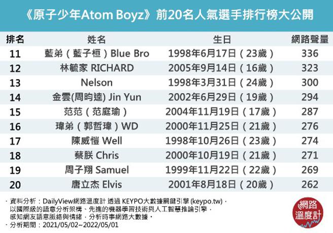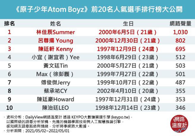 【网路温度计调查结果之图文,未经授权请勿转载、改写】分析说明:本研究资料由《KEYPO大数据关键引擎》提供,分析时间范围为2021年05月02日至2022年05月01日,共一年。系统观测上万个网站频道,包括各大新闻频道、社群平台、讨论区及部落格等,针对讨论『原子少年Atom Boyz』相关文本进行分析,并根据网友就该议题之讨论,作为本分析依据。本文所调查之结果,非参考投票、民调、网路问卷等资料,名次仅代表网路讨论声量大小,不代表网友正负评价。