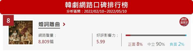 ▲《婚词离曲》位于《网路温度计》韩剧口碑排行榜第8名。