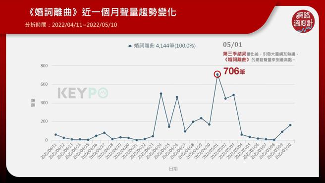 除了上述剧情,第三季的其他地方看起来也有许多伏笔,让不少观眾觉得好像还有继续发展的空间,但对于会不会开拍第四季,任作家则语带保留,表示「这并非作家能决定的部分」。不论如何,第三季如此「震撼」的结局,已经先让大家留下了深刻的印象。透过《KEYPO大数据关键引擎》可以看见,在5月1日第三季结局播出后,《婚词离曲》的网路声量,直接来到了最高点。