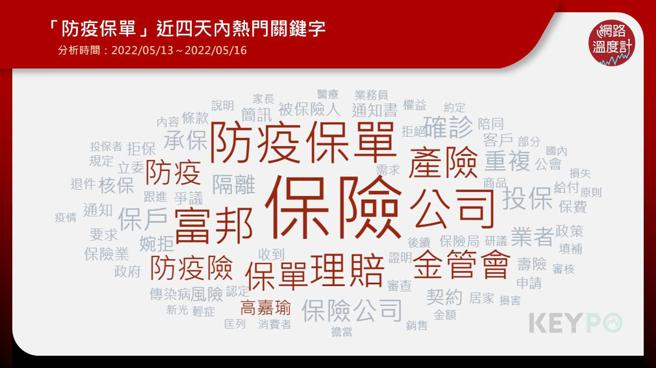 分析区间:本文分析时间范围为2022年05月13日至2022年05月16日。资料来源:《KEYPO大数据关键引擎》拥有巨量资料,以人工智慧作语意分析之工具资料搜集范围:累积超过10亿笔以上的网路数据库,其内容涵盖新闻媒体、社群平台、讨论区、部落格、地图评论等网站。研究方法:系统观测上万个网站频道,包括各大新闻频道、社群平台、讨论区及部落格等,针对讨论『防疫保单』相关文本进行分析,调查「网路声量」(注1)、「热门关键字」(注2)作为本分析依据。*注1 网路声量:透过『KEYPO大数据关键引擎』,计算社群讨论及新闻报导提及的文章则数,声量越高代表讨论越热,能见度越高。*注2 热门关键字:透过『KEYPO大数据关键引擎』,萃取网路上的文章与主题共同出现的关键热词;次数越多,字词越大;可用来厘清核心议题与重点人事物。