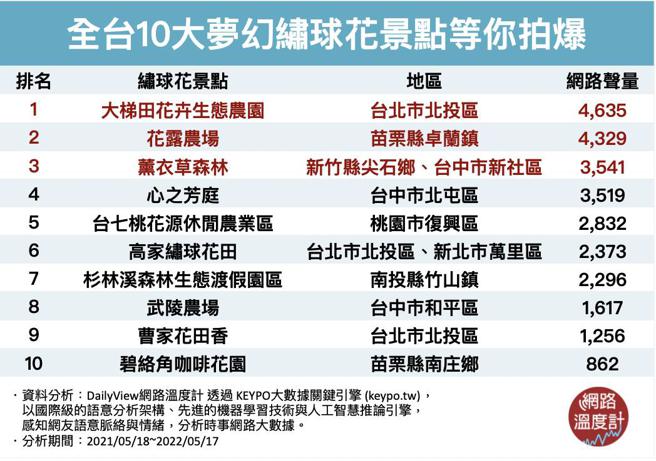 今天就让《DailyView网路温度计》透过《KEYPO大数据关键引擎》一起来看全台10大绣球花热门景点,大家在赏花的同时也不要忘记戴口罩、勤洗手及保持社交距离。
