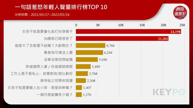 民调数据显示,在最多可选择三个标籤的情况下,49.2%受访者不喜欢的年龄标籤是「赶快生小孩,我在你这年纪都生两个了/有两个小孩」;其次则是42.4%不喜欢「超过30岁就老了」的标籤。