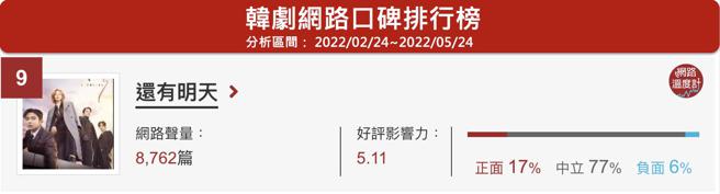 ▲《还有明天》位于网路温度计韩剧口碑排行榜第9名。