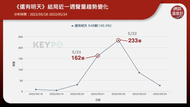 透过《KEYPO大数据关键引擎》观察,近一周以来《还有明天》结局在网路上的讨论声量548笔,热度仅维持在播出当天及隔天,之后随即退烧,相当可惜。
