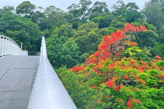 【旅奇传媒/编辑部报导】梅雨纷飞的季节,彰化八卦山天空步道旁的凤凰木林提前绽放火焰般凤凰花!交通部观光局参山国家风景区管理处近日发现天空步道旁凤凰树林开始吐露花蕊,今年花期提前报到,如火焰般花色让人惊艷,邀请民眾端午连假来八卦山赏花,做好防疫同时可以健行强身呼吸到山区清新空气,提升自身免疫力。