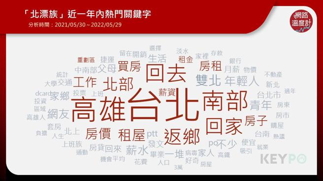 本文分析时间范围为2021年05月30日至2022年05月29日。资料来源:《KEYPO大数据关键引擎》拥有巨量资料,以人工智慧作语意分析之工具资料搜集范围:累积超过30亿笔以上的网路数据库,其内容涵盖新闻媒体、社群平台、讨论区、部落格、地图评论等网站。研究方法:系统观测上万个网站频道,包括各大新闻频道、社群平台、讨论区及部落格等,针对讨论『北漂族』相关文本进行分析,调查「热门关键字」(注1)作为本分析依据。*注1 热门关键字:透过『KEYPO大数据关键引擎』,萃取网路上的文章与主题共同出现的关键热词;次数越多,字词越大;可用来厘清核心议题与重点人事物。