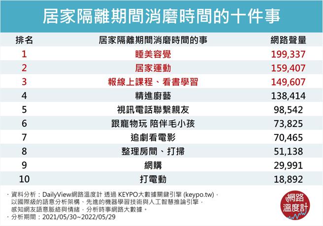 系统观测上万个网站频道,包括各大新闻频道、社群平台、讨论区及部落格等,针对讨论『居家隔离期间消磨时间的事』相关文本进行分析,并根据网友就该议题之讨论,作为本分析依据。