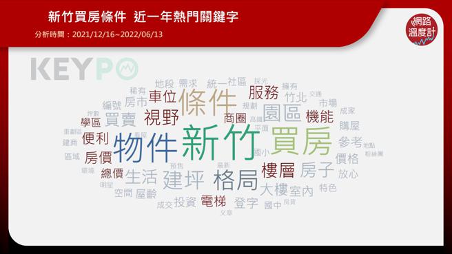 分析区间:本文分析时间范围为2021年12月16日至2022年06月13日。资料来源:《KEYPO大数据关键引擎》拥有巨量资料,以人工智慧作语意分析之工具资料搜集范围:累积超过30亿笔以上的网路数据库,其内容涵盖新闻媒体、社群平台、讨论区、部落格、地图评论等网站。研究方法:系统观测上万个网站频道,包括各大新闻频道、社群平台、讨论区及部落格等,针对讨论『新竹买房条件』相关文本进行分析,调查「热门关键字」(注2)作为本分析依据。*注2 热门关键字:透过『KEYPO大数据关键引擎』,萃取网路上的文章与主题共同出现的关键热词;次数越多,字词越大;可用来厘清核心议题与重点人事物。