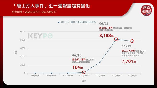 本文分析时间范围为2022年06月07日至2022年06月13日。资料来源:《KEYPO大数据关键引擎》拥有巨量资料,以人工智慧作语意分析之工具资料搜集范围:累积超过30亿笔以上的网路数据库,其内容涵盖新闻媒体、社群平台、讨论区、部落格、地图评论等网站。研究方法:系统观测上万个网站频道,包括各大新闻频道、社群平台、讨论区及部落格等,针对讨论『唐山打人事件』相关文本进行分析,调查「网路声量」(注1)作为本分析依据。*注1 网路声量:透过『KEYPO大数据关键引擎』,计算社群讨论及新闻报导提及的文章则数,声量越高代表讨论越热,能见度越高。