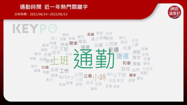 透过《KEYPO大数据关键引擎》舆情分析系统来看「通勤时间」近一年热门关键字,可以看到上班或上课通勤的民眾主要都在讨论通勤方式和时间的关系:像是骑机车、开车、搭台铁列车、捷运、甚至还有搭高铁上班的。也有部分民眾会讨论通勤的优惠定期票月票等等。
