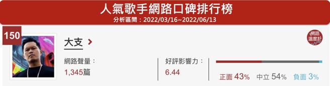 ▲大支位于网路温度计人气歌手口碑排行榜第150名。