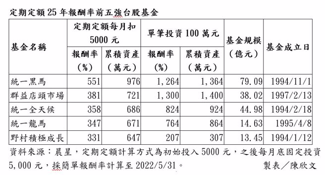 今年来的俄乌战争、大陆封城,导致原物料飙涨与供应链断链加剧,通膨居高不下,逼得美国联准会暴力升息,股市跌入熊市,全球景气衰退的担忧升高。其实景气多空循环是常态,一般人只要挑选专业团队好基金,把这些复杂问题交给专家,稳定且耐心定期定额,也能轻松滚出千万资产。近两年才进入股市的投资人,现正经歷人生首次熊市衝击,纷纷从股市毕业,财富自由梦碎。理财专家表示,从股市短期暴富的人是少数,上班族要靠小钱滚出千万资产,採用「定期定额微笑投资法」最易执行。大部份人是25岁展开职场生涯,只要专注本业工作,每月扣款5,000元,一年6万元,25年累计投入150万元,选择年化报酬率可创造出至少10%的主动式台股基金,50岁时这笔本金就能翻涨数倍,甚至达到一千万元目标。要如何选择专业团队好基金?根据晨星回测,筛选出定期定额25年报酬率前五强的台股基金,发现统一投信就包办了三檔,包括统一黑马、统一全天候、统一龙马。其中,统一黑马基金定期定额报酬率位居第一,投资人若持之以恒每月扣5,000元,至今累积资产已有976万元,若是一开始单笔投资100万元,耐心长抱至今累积资产高达1,364万元!千里之行始于足下,台湾基金公司设立之初,就是以台股基金出发,统计成立超过25年且目前仍存活的台股基金共有39檔,为何统一投信旗下基金表现明显胜出?据了解,统一投信30年来投入大量资源在培养专业投资研究团队,基金经理人在金融市场平均资歷有17年,研究员平均研究年资也近9年。负责带领各投研单位的部门主管则多拥有至少20年金融歷练,可说是经过大风大浪考验的战将。这次筛选出好基金榜单里的统一黑马、统一全天候、统一龙马三檔基金,都是在1994年至1995年成立,经歷过1997年亚洲金融风暴、2000年网通泡沫、2008年金融海啸,2018年美中贸易战、2020年新冠疫情衝击。由于定期定额是十年、二十年的投资规划,建议投资人在挑选基金标的时,选择有团队基础的基金公司,不论在总经研究、对产业与被投资公司的掌握度,都能拥有充足的资源、人才与专业,支持旗下基金长期绩效表现稳健。