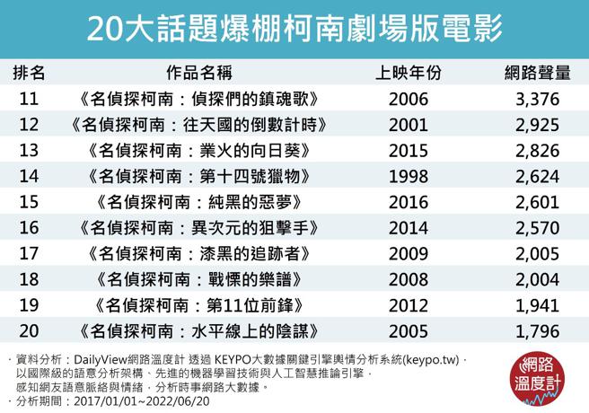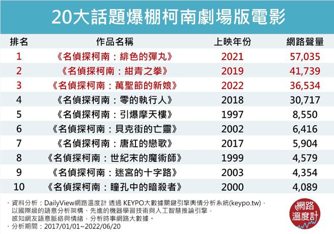 本研究资料由《KEYPO大数据关键引擎》舆情分析系统提供,分析时间范围为2017年01月01日至2022年06月20日,共5年。系统观测上万个网站频道,包括各大新闻频道、社群平台、讨论区及部落格等,针对讨论『柯南剧场版电影』相关文本进行分析,并根据网友就该议题之讨论,作为本分析依据。本文所调查之结果,非参考投票、民调、网路问卷等资料,名次仅代表网路讨论声量大小,不代表网友正负评价。