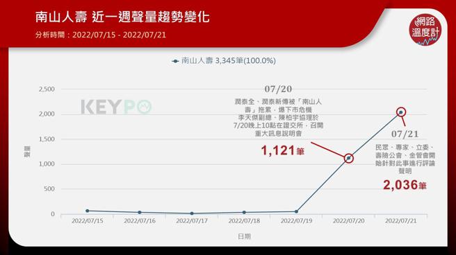 进一步透过《KEYPO大数据关键引擎》舆情分析系统观察「南山人寿」(时间:2022/07/15 - 2022/07/21)近一周网路声量,共有3,345笔,可以看到7月20日媒体开始报导润泰全(2915)、润泰新(9944)爆出下市危机,网路上就开始有讨论,到隔天7月21日讨论度也不减,不管是政治人物、财经专家或者是金管会、寿险公会都开始针对说明会、润泰官方说法进行评论声明。