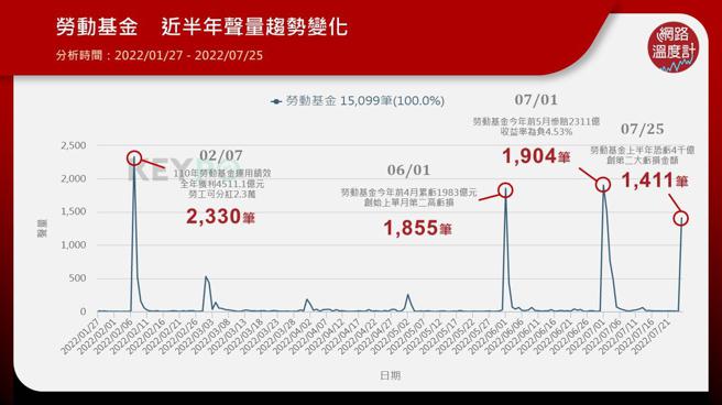 进一步透过《KEYPO大数据关键引擎》舆情分析系统观察「劳动基金」(时间:2022/01/27 - 2022/07/25)近半年网路声量,共有15,099笔,可以看到一共有4个高峰点,第一波高峰是二月宣布劳动基金大赚4511亿元,新制每户劳工平均可分红2.3万元,接下来的高峰都是亏损消息。