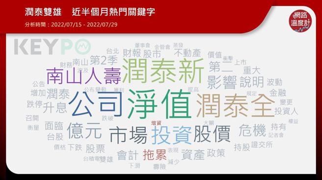 最后从《KEYPO大数据关键引擎》舆情分析系统观察「润泰双雄」(时间:2022/07/15 - 2022/07/29)近半个月的热门关键字,「净值」、「南山人寿」、「拖累」、「投资」、「股价」、「升息」等一词皆上榜,可见这一波润泰双雄净值危机,网友十分关注。