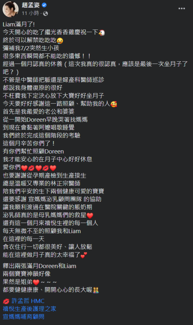 赵孟姿表示终于迎来二宝Liam满月,决定解禁吃咸酥鸡庆祝一番,弥补生小孩后很多东西都不能吃的遗憾,经过一个月认真休养,復原状况相当良好,让她坦言不枉费下定决心放下大宝好好坐月子,如今终于完成这个阶段的考验,也感谢家人及医生、护士等人协助及照顾,更晒出姊弟俩满月时的合照做对比,希望两人都要健健康康、开开心心的长大。