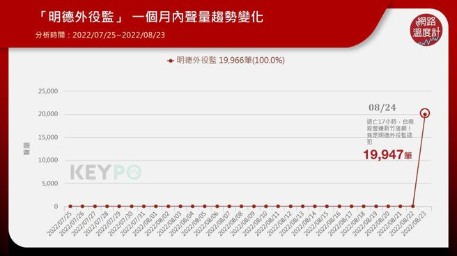 从《KEYPO大数据关键引擎》舆情分析系统显示,一个月内关于「明德外役监」的声量趋势共有19,966笔。网友纷纷讨论:「一周前就逃狱了,居然完全没新闻」、「一周前竟然没有看到有监狱逃犯的报导,消息压得真好」、「因为在外役监服刑的受刑人,刑期都不长」、「外役监制度要检讨,过太爽还会逃」。