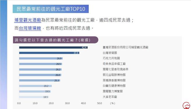 《疫后的旅游商机》调查数据显示,网路声量较高30间观光工厂中,民眾参与度前五高的观光工厂依序为:臺湾菸酒股份有限公司埔里观光酒厂(42.4%)、台湾玻璃馆(37.3%)、巧克力共和国(26.9%)、奇美食品幸福工厂(26.5%)、雅闻七里香玫瑰森林(26.2%)。其中,臺湾菸酒股份有限公司埔里观光酒厂是本次调查知名度与参与度的双料冠军。奇美食品幸福工厂以及雅闻七里香玫瑰森林,虽然知名度略低,但参与度则挤进排行榜前五。