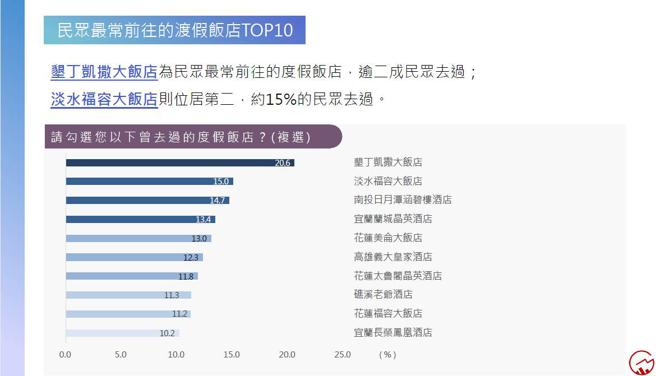 《疫后的旅游商机》调查数据显示,垦丁凯撒大饭店参与度20.6%最高,其次依序为淡水福容大饭店15.0%、南投日月潭涵碧楼酒店14.7%、宜兰兰成晶英酒店13.4%、花莲美仑大饭店13.0%。