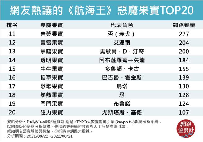 《航海王》连载至今已经25年,是不少人从小看到大的作品,几乎所有人的童年中都有这部动漫的存在。剧场版上映,除了在粉丝间讨论热烈外,也勾起许多人的回忆。除了主角一行人热血的冒险故事和深刻的情谊,说到《航海王》大家印象最深刻的应该就是里面的「恶魔果实」了吧?今天《DailyView网路温度计》透过《KEYPO大数据关键引擎》舆情分析系统,调查出了《航海王》中最受网友热议的前20大恶魔果实,一起来看看吧!