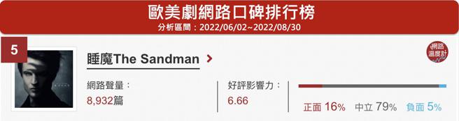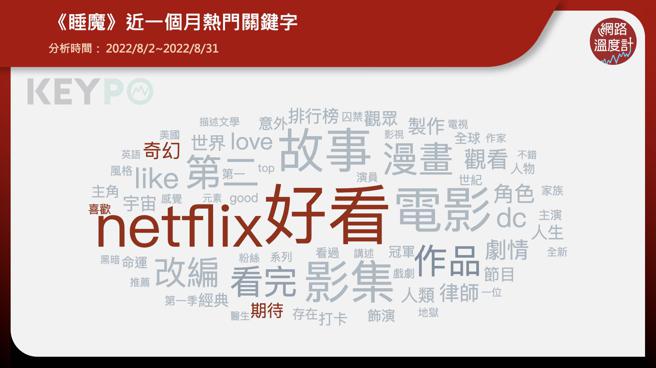 Netflix影集《睡魔》目前位居《网路温度计》欧美剧口碑排行榜第5名,透过《KEYPO大数据关键引擎》舆情分析系统观察其网路热门关键字,可以发现「好看」占相当大宗,其他还有「奇幻」、「喜欢」、「期待」等字词出现。可见观眾对这部魔幻影集的高度评价与讚赏,难怪网友们纷纷敲碗Netflix续订第二季,如果你还没看过的话,不妨趁周末假期追一波吧!