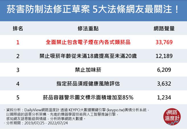 看完上述网路上前五大广受关注的修正草案后,接力透过《KEYPO大数据关键引擎》舆情分析系统,分析这次榜单第一名《菸害防制法修正草案》,究竟7大修法中,有哪些法条至今在网路上仍具有讨论度!