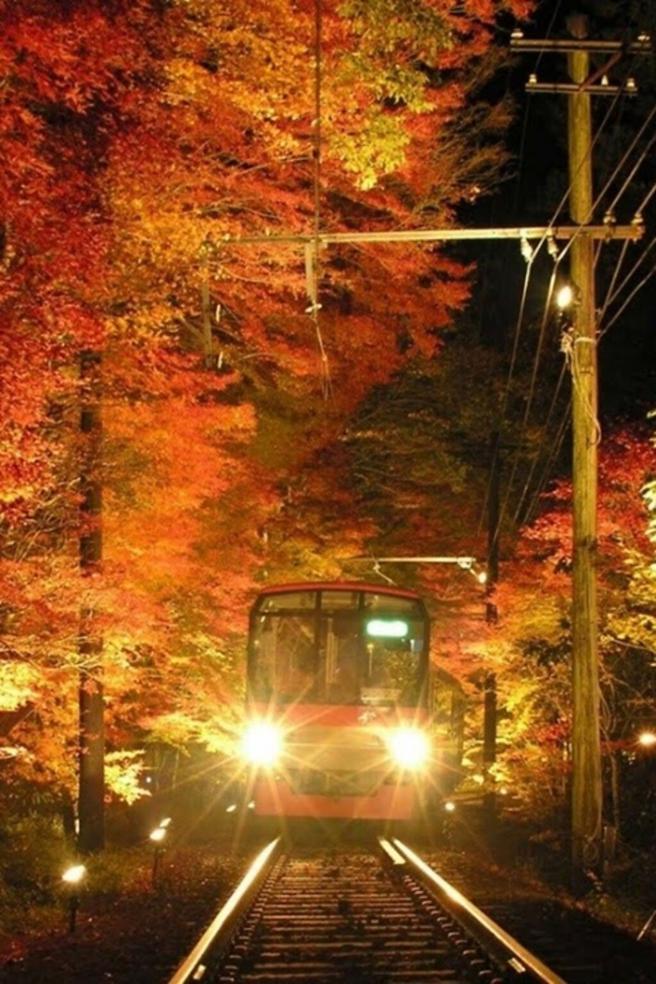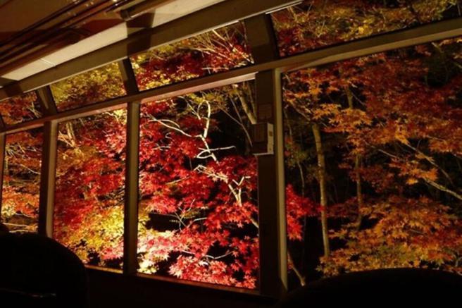 而搭乘叡山电车往返贵船的路上,也能在贵船口站、二之濑站观赏红叶点灯。当列车行经至市原站~二之濑站约250公尺长的红叶隧道路段时,还会把特别放慢速度、关掉车内照明,让大家从车窗细细品味铺天盖地的红叶景观。