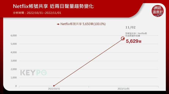 从《KEYPO大数据关键引擎》舆情分析系统显示「Netflix帐号共享」声量趋势,在11月1日一日瞬间衝高至5,629笔。消息一出,网友纷纷表示,「那就只好退坑了,里面也没有什么新片可以选择」、「一旦这样做其它串流平台大概会有很大的概率跟进」、「这是Netflix推出的寄生虫杀虫剂吗」、「台湾还没开始啦不用紧张,可以再寄生一下」、「Netflix是在帮Disney+增加客户吗」、「共用仔崩溃」、「完全是把用户推向别家串流的政策」。