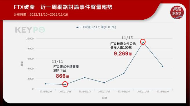FTX破产至今短短一周,效应不断在全球延烧,从《KEYPO大数据关键引擎》舆情分析系统来看近一周声量超过两万笔,台湾方面也有不少受害者,初估有高达50到60万的受害者,每人损失金额在3千至5千美元不等,媒体报导投资人组成6,000人的自救群组,企图讨回数十亿的资产。