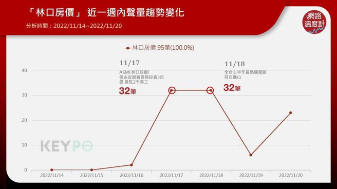 林口工一市地重划区位于在林口文化北路二段东侧,全区108公顷、产业专用区就占67.11公顷,新北市地政局预估未来年产值将至少有500亿元以上。不少人也关心对房价的影响,从《KEYPO大数据关键引擎》舆情分析系统指出,「林口房价」声量在消息释出后,11月17、18日有明显提高。