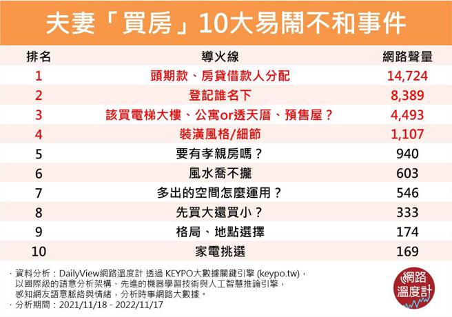 这次《DailyView网路温度计》就进一步透过《KEYPO大数据关键引擎》舆情分析系统调查,找出网路上夫妻买房10大最容易吵架的导火线,提供给正在寻房购屋的夫妻,尽量在这些问题点上多沟通、互相尊重才是相处之道喔!
