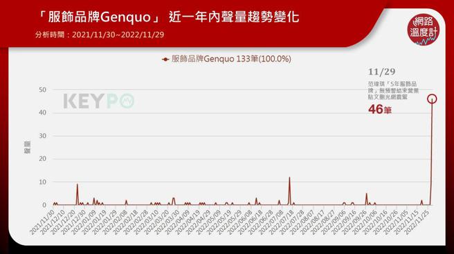 从《KEYPO大数据关键引擎》舆情分析系统显示,近一年内关于「服饰品牌Genquo」的声量趋势仅有133笔。声量最高则是11月29日释出结束营业的消息,显见品牌未受到网友、消费者关注与讨论,近一年也几乎鲜少进行网路行销、宣传活动。