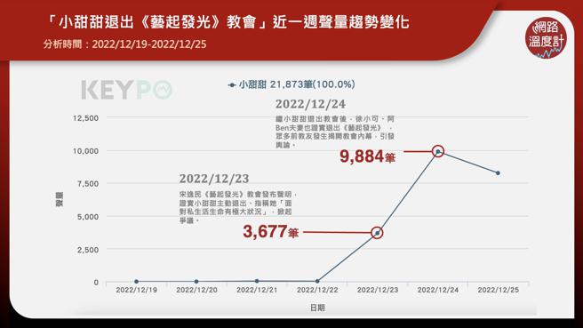 透过《KEYPO大数据关键引擎》舆情分析系统观察,短短一周内,小甜甜退出《艺起发光》教会事件的相关声量已累积突破2万笔,声量高峰落在12月24日,继小甜甜退出后,徐小可、阿Ben夫妻也证实退出,单日创下9,884笔网路声量。许多前教友也站出来发声,揭开教会内幕,让舆论持续延烧。