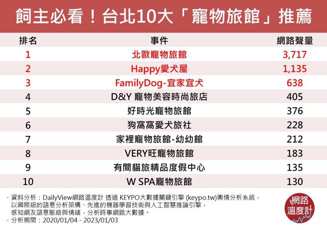 系统观测上万个网站频道,包括各大新闻频道、社群平台、讨论区及部落格等,针对讨论『台北市宠物旅馆』相关文本进行分析,并根据网友就该议题之相关趋势讨论,作为本分析依据。本文所调查之结果,非参考投票、民调、网路问卷等资料,名次仅代表网路讨论声量大小,不代表网友正负评价。