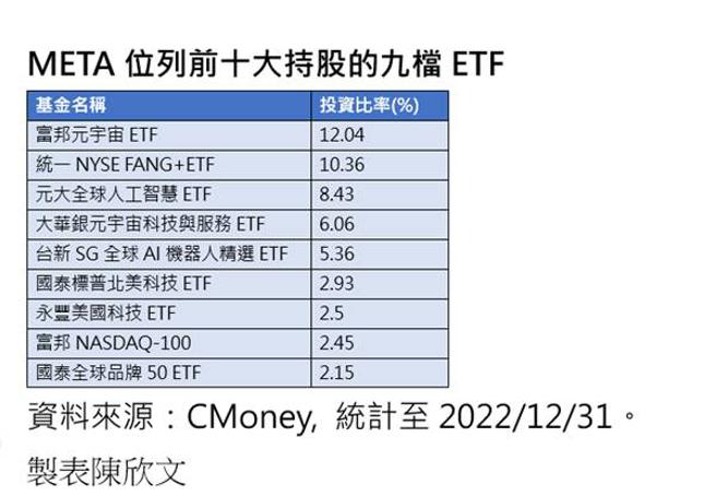 2月1日Meta公布最新财报及展望,优于市场预期,激励股价当日盘后大涨。2日Meta延续强劲涨势,股价达到188.77美元,创下去年6月初以来新高,单日涨幅高达23.28%,强势站上年线。截至去年底,台湾上市挂牌的海外股票型ETF中,共有九檔ETF的前10大持股持有Meta。前两檔ETF的Meta持股比例,甚至都在一成以上。其中,成分股皆为科技巨头的统一FANG+ ETF,Meta持股比例达到10.36%。