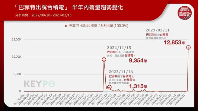 从《KEYPO大数据关键引擎》舆情分析系统显示,近半年内(2022/08/20-2023/02/15)巴菲特买进及出脱台积电ADR声量趋势累积46,644笔。去年11月15日,波克夏砸逾1200亿买进台积电ADR,创下9,354笔声量。