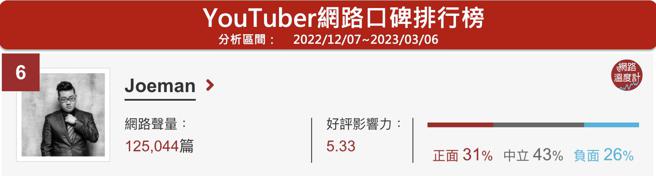 百万YouTuber Joeman时常与其他网红、创作者合作,频道推出的《Joe是要对决》、《Joe是要看房》等系列主题影片也受到观眾喜爱与推崇,让他位居《DailyView网路温度计》YouTuber网路口碑排行榜第6名。