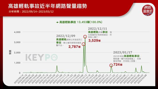 根据《KEYPO大数据关键引擎》舆情分析系统(日期:2022/09/14~2023/03/12)近半年统计调查,「高雄轻轨事故」近半年声量最高点出现在2022年12月11日,共3,529 笔网路声量。当天一位65岁的小黄运将驾驶计程车行经南屏、大顺路口,向左迴转时,不慎与轻轨列车发生碰撞,经查这辆计程车违规左转,而且不听路口义交指挥,强行穿越轻轨轨道路口,以致与行驶中的轻轨碰撞。而该起事件也是高雄轻轨2022年第14件事故,加上事发两天前才有轻轨死亡事故,因此造成大批网友讨论。