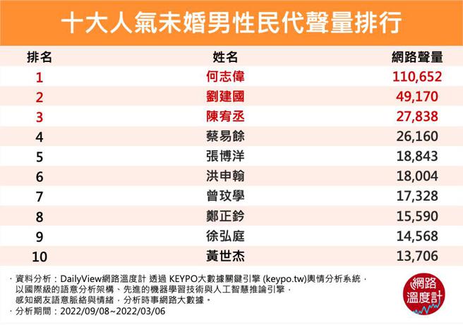文化大学广告系专任教授兼系主任钮则勋表示,现在不婚主义愈来愈明显,有些政治人物也是抱持不婚主义。钮则勋说,可能有些民代曾经交往过不错的对象,却错失结婚机会,但若有另一半,其实顺其自然即可,不用刻意避开或隐藏,只要不是负面新闻,支持者都会给予祝福。钮则勋以台湾选举为例,如果是男性已婚民代,选情最后关键时刻,经常会请另一半当分身打「爱妻牌」,因为另一半会有话题性,若是鲜少曝光的「牵手」亮相,大家也会想知道她长什么样,类似八卦讨论的概念。单身男民代虽然少了这项利器,但也可以靠其他选举操作来加分。今天《DailyView网路温度计》透过《KEYPO大数据关键引擎》舆情分析系统,统计出近半年10位人气最高的未婚男民代,您心目中的那一位民代有上榜吗?