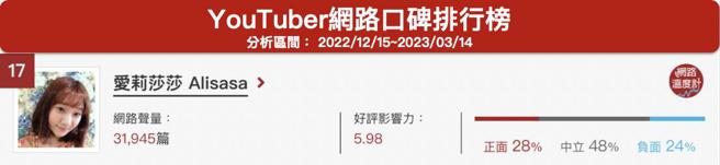 百万人气YouTuber爱莉莎莎先前因为万华毒窟、肝胆排石法事件遭炎上,经过一段时间沉淀后,爱莉莎莎不仅以自身实战经验传授YouTube等自媒体经营稳定长红的流量密码,自媒体销售学课程短短开卖10天就销售逾5千6百万元。10日爱莉莎莎也宣布创立品牌「ALSS」,推出3款香氛蜡烛,2天就正式突破200万元的好成绩,话题不断的她在《DailyView网路温度计》YouTuber网路口碑排行榜也位居第17名。