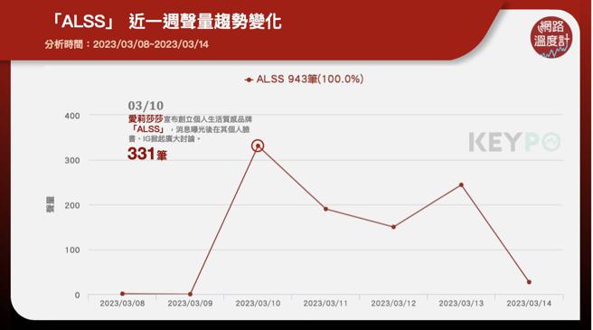 从《KEYPO大数据关键引擎》舆情分析系统来看近一周「ALSS」声量趋势,可见3月10日爱莉莎莎创立品牌ALSS的消息曝光后,在个人脸书、IG都掀起网友热烈迴响,「莎太会了」、「好有质感」、「全部都想买」、「已经下单,好期待」、「打算3款都买支持莎莎,对气味也很挑剔的我相信妳的鼻光」、 「好厉害,多元斜杠」,当日网路声量也累积331笔。