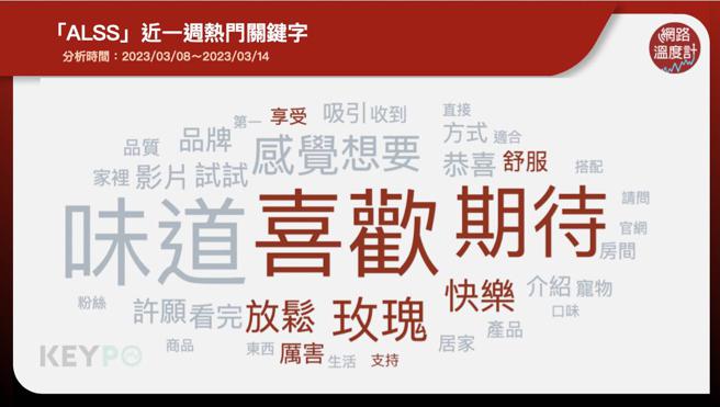 此外,从近一周「ALSS」热门关键字,除了不少观眾纷纷选择消费支持爱莉莎莎,「午夜玫瑰」香氛蜡烛也受到大多数人喜爱、热烈抢购,另外也能发现网友对于ALSS给予享受、喜欢、放松、快乐、舒服、期待、厉害等正面评价。