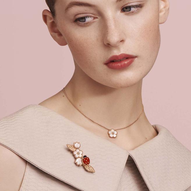 今年全新登场的Lucky Spring系列珠宝包括吊坠、Between the Finger指间戒、手炼等,充满春暖花开的意象,并以宝石增添璀璨光芒,白色珍珠母贝、缟玛瑙和红玉髓,勾勒玲珑剔透的春天美景,以铃兰、瓢虫和白梅花等充满幸运与美好的意寓,勾勒万象更新的春天气息。