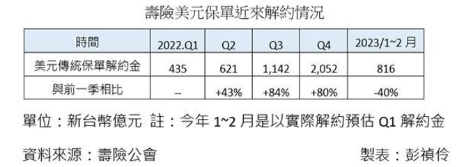 台湾寿险业爆流动性压力?寿险公会23日紧急发布四大理由,打脸这项预估,一是去年10月因美元利率、匯率双涨,第四季美元保单解约金达新台币2,052亿元,但今年第一季估约1,230亿元,已减少四成,解约已放缓,同时美元双率再同时攀高空间有限,保单解约潮可望缓解,同时今年前二月保险收入3,260亿元,已大于保险给付3,166亿元,呈现资金净流入94亿元。