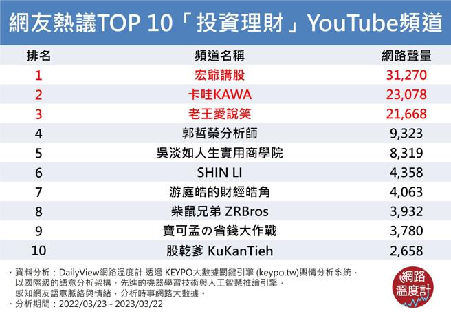 加上近几年许多投顾分析师虽然任职于各大证券公司,但自己也纷纷自创Youtube频道,分享自身投资理财经验,这次《DailyView网路温度计》透过《KEYPO大数据关键引擎》舆情分析系统,排除媒体自营、财经主播经营频道,针对自己自营的频道列入调查分析,整理统计出近一年网友热议的「投资理财10大YouTube频道」,值得关注的是进榜的10大投资理财频道,有些Youtube订阅数虽然比较低,但其粉丝黏着度相当高,许多频道只要影片一上线,立即就会引起大量留言讨论,被眾网友激推是投资理财这条道路上的明灯。