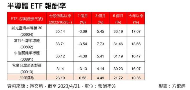 (半导体ETF报酬率。图/新光投信提供) 法人看好AI长线趋势带动半导体成长新契机,2024年产业景气有望重启V型復甦,趁第二季挑选季配息半导体ETF掌「息利双收」,投资人可逢回找买点;如新光臺湾半导体30 ETF(00904),预估4月25日为今年第2次除息日,4月24日最后交易日进场布局,将能掌握股价成长兼顾配息收入。观察新光臺湾半导体30 ETF每季配息纪录,从2022年3月上市至今,计有2次季配息且达成100%完全填息纪录,年化配息率约3%以上。适逢第二季为半导体产业表现最坏情况,半导体ETF股价拉回探底过程中,中长线布局的低接买点有望浮现。法人指出,台积电第一季法说定调库存调整持续进行,第二季为全年营收低点,第三季回到正常水准,下半年营运回升。今年资本支出维持320亿~360亿美元目标不变,显示公司握有客户订单支持。第二季为台积电营运低点,也表示第三季将是下波成长的起点。台积电客户持续看好新制程需求,如3奈米制程,第一、二年开案量是上世代5奈米制程的2倍,这点一扫市场对客户订单担忧。台积电考虑将台湾高雄厂定位,由原先的成熟制程,调整为先进制程优先,以因应未来潜在高速运算(HPC)、物联网(IoT)、人工智慧(AI)等新订单大量需求,同时,由ChatGPT带动的AI领域新应用需求,目前仍于初期阶段,相关高速运算、AI伺服器会是带动半导体产业长期成长动能。展望2023年,新光臺湾半导体30 ETF经理人王韵茹强调,半导体产业链目前正进入产业景气循环下的库存调整周期,需花一段时间去化库存,股价也将同步拉回整理。不过,长期来看,全球科技产业朝向5G/6G、电动车、自动驾驶、AI、HPC方向不变,估计2024年后,全球半导体产业有望迎向新成长周期,看好2024年全球科技在人机共想、共做的智慧新应用需求下,将带领台湾半导体族群迎来下一波高峰。王韵茹建议,投资人趁第二季逢市况拉回,逢低布局「季配息」的半导体ETF,中长期持有拥有「息利双收」优势。以新光臺湾半导体30 ETF来说,主要追踪有「台版费半」之称的「臺湾全市场半导体精选30指数」,囊括台湾半导体产业市值前30强,30檔成分股中,具生成式AI应用比重高,掌握AI新趋势题材,台积电占比近30%,为ETF最大持股。