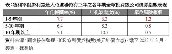 此外,美国2年期至10年期公债殖利率自去年7月起开始倒挂,目前仍维持倒挂态势;吴艷琴指出,殖利率倒挂环境下,短年期债息收益率高于长年期债息收益率,同时兼具较低的波动风险,「短年期债券单位风险报酬明显优于中长年期债券。」以回测数据观察,2006年10月殖利率倒挂利差最大值进场并持有3年,1至5年期债券年化报酬率7.7%、波动度6.2%,单位风险报酬1.2;5至10年期债券年化报酬率6.4%、波动度8.2%,单位风险报酬0.8;10年期以上债券年化报酬率则为5.1%、波动度10.7%,单位风险报酬则为0.5,显示在「殖利率倒挂的环境下,短年期债具低波高息的优势,可以兼顾收益与风险。」