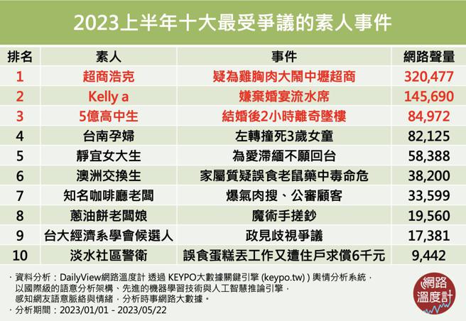《DailyView网路温度计》透过《KEYPO大数据关键引擎》舆情分析系统,调查2023上半年最受争议的素人事件,一起来看看有哪些议题掀起各界议论、引发网友高度关注同时创下超高网路声量!